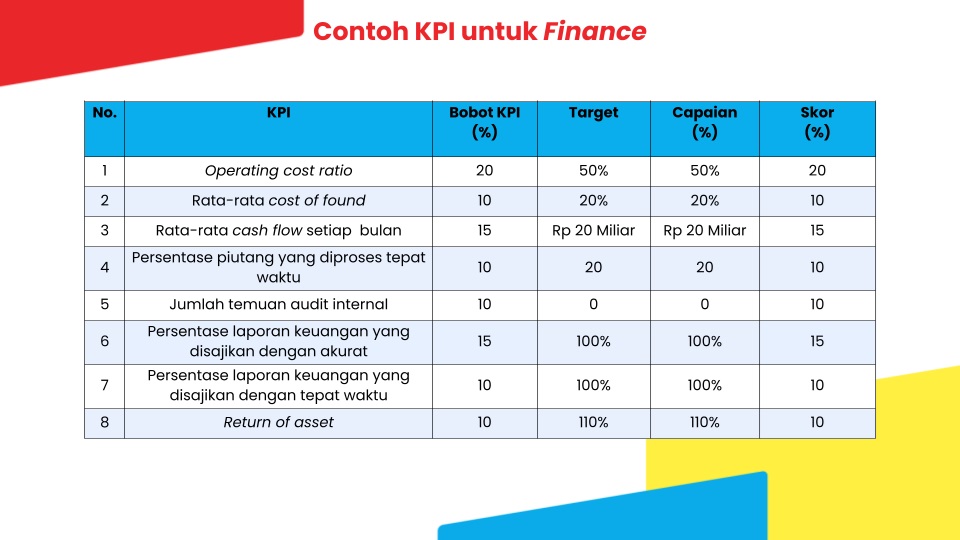 Contoh KPI finansial di antaranya adalah memperbaiki quick ratio hingga 50% pada Desember 2022, atau meningkatkan ROI hingga 30% pada Desember 2022.