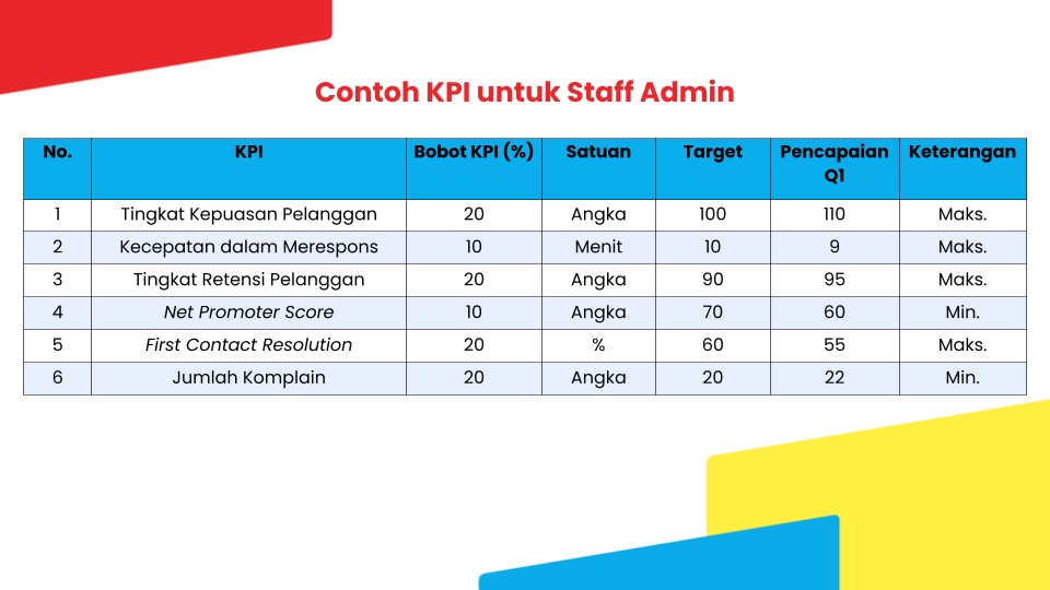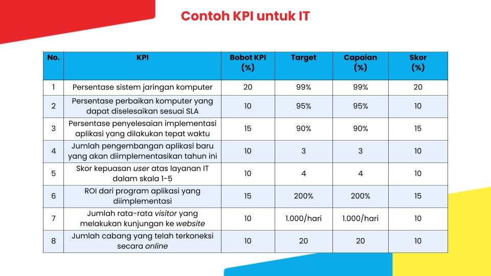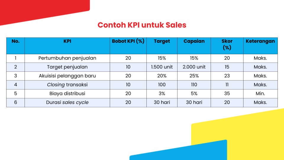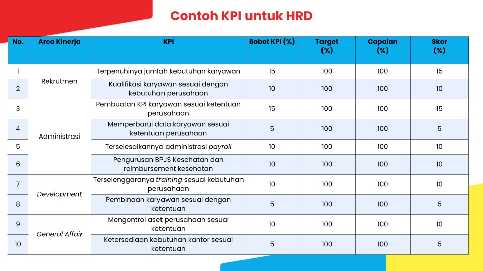 Seperti yang dilihat pada contoh di atas, semua KPI-nya terukur dan ada deadline masing-masing. Jadi, kinerja tiap karyawan atau departemen tidak akan berada di grey area atau sulit untuk dikategorikan. Kategorinya hanya ada dua; berhasil dan tidak berhasil mencapai target.